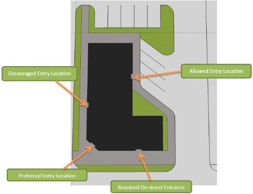 Parking lots, located in all commercial zoning districts, with the exception of the Central Commercial zoning district, with frontage on the public rights-of-way are required to have a set-back distance of ten feet (10) from the property line and suitably landscaped with year round green plantings to aesthetically improve the appearance of the area. The plantings should not interfere with line-of-sight distances.