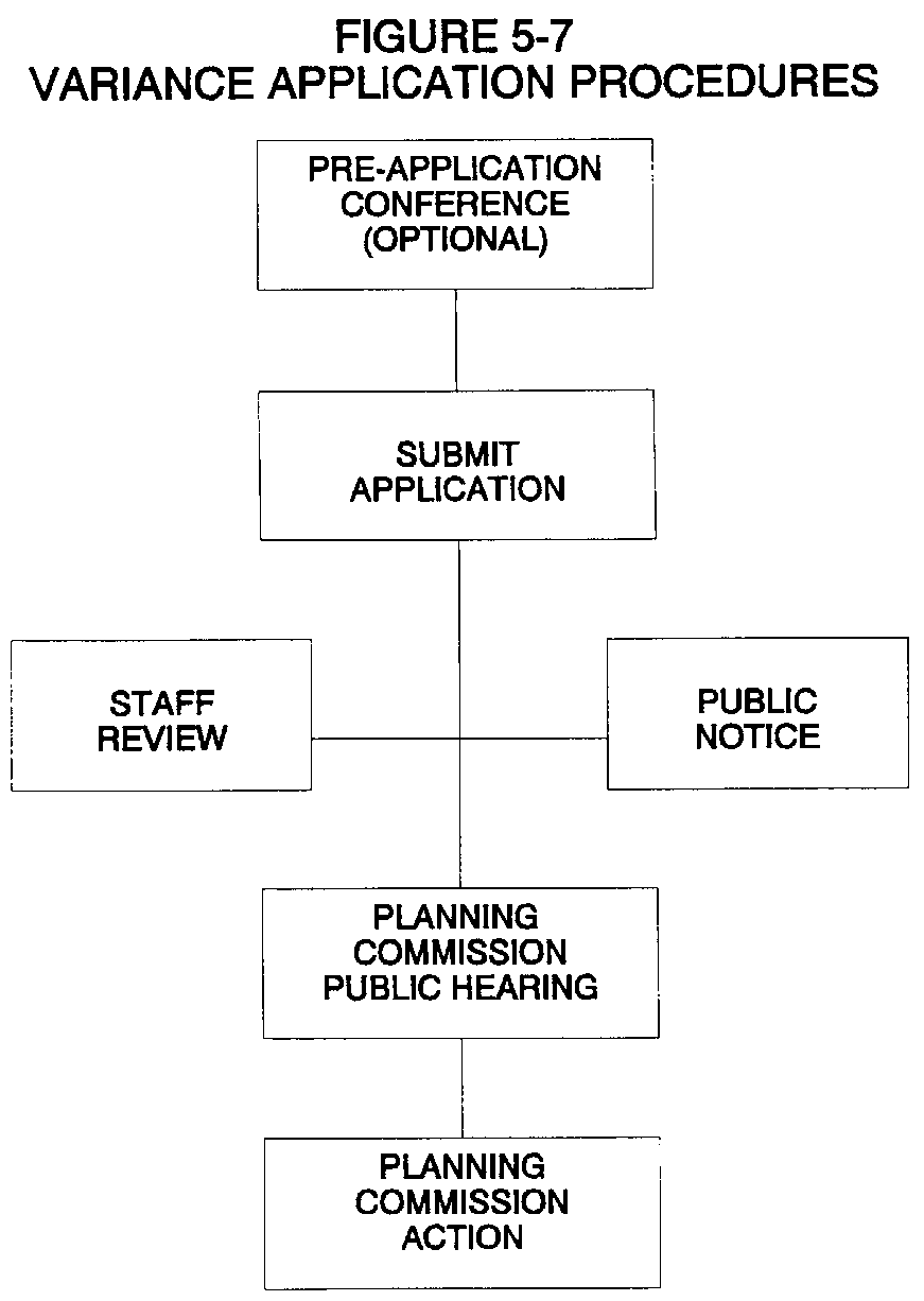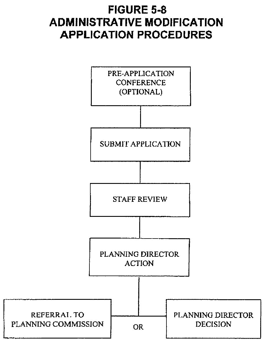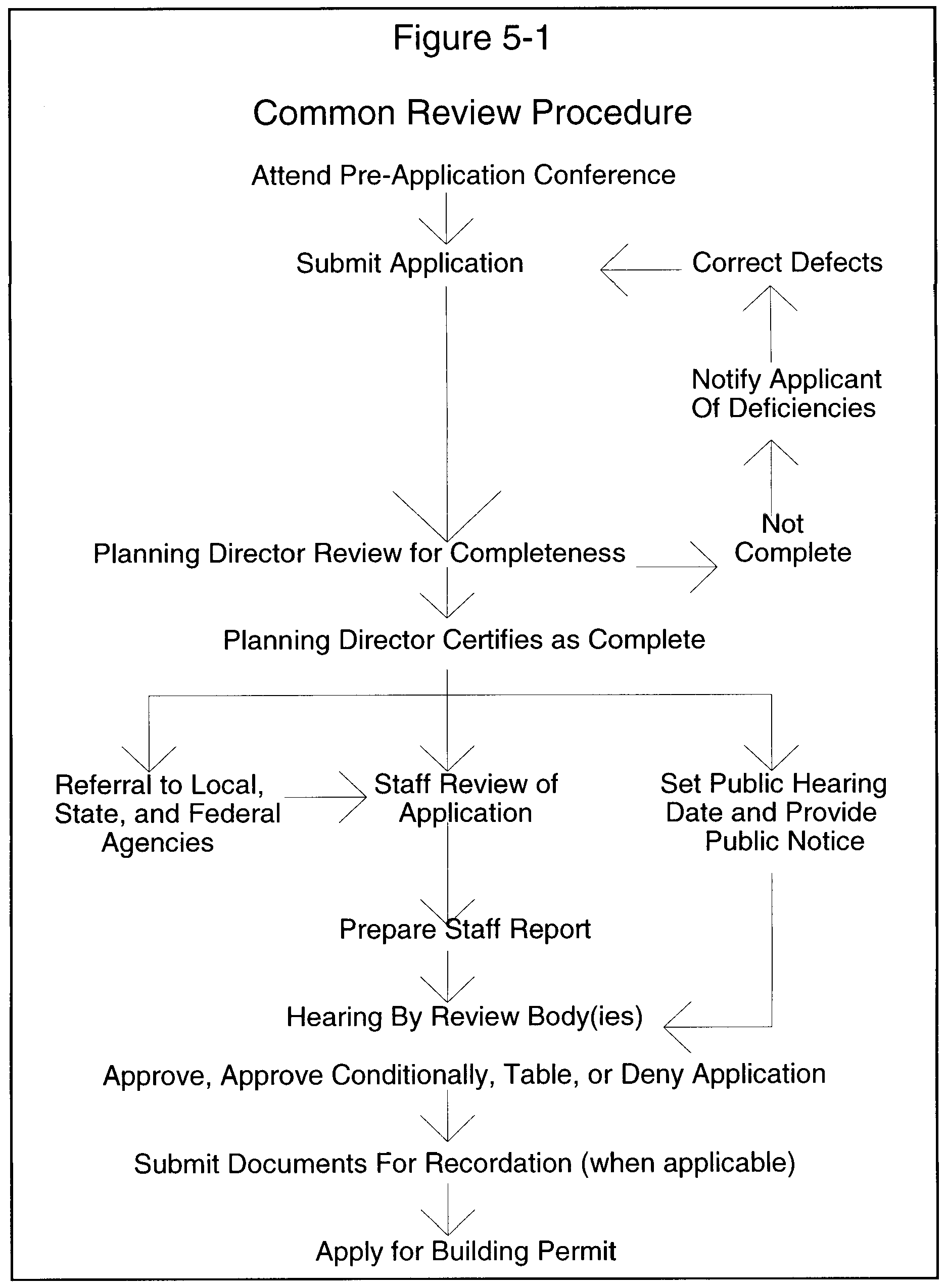 How the Common Procedure Applies to Particular Applications. Table 5-1, Summary of Development Review Procedures, indicates how certain elements of the common procedure apply to each type of application. It describes whether the pre-application conference is mandatory or optional for each type of application, which body is authorized to review, act upon or hear appeals for each type of application and whether public notice is required for the application.