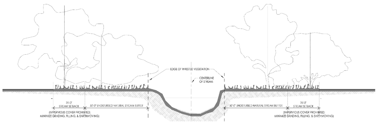 An undisturbed natural vegetative stream buffer shall be maintained for 50 feet, measured horizontally, on both banks (as applicable) of a stream as measured from the edge of wrested vegetation.
