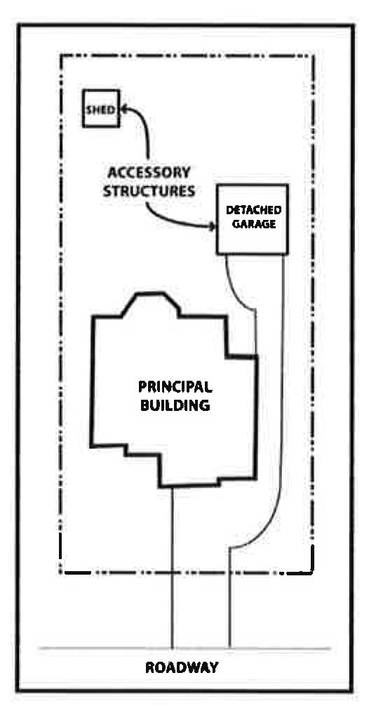 Accessory use or structure: A use or structure incidental and subordinate to the principal use of the land or a building on the same lot, serving a purpose customarily incidental to the principal use or structure and located behind the front wall of the principal building. An accessory use or structure is not allowed without the existence of a principal structure or use on the zoning lot. See figure 1.