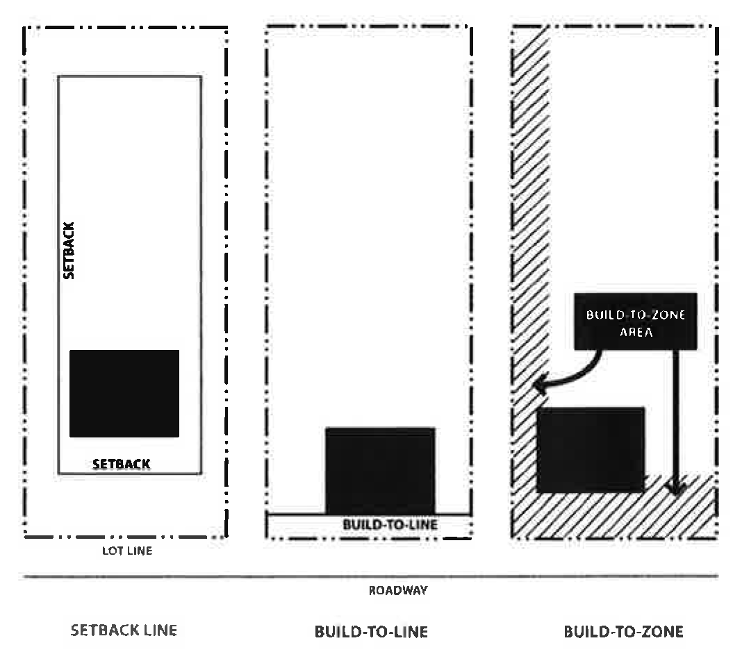 Build-to-line: The exact distance that a building must be located from the street right-of-way. See figure 2.