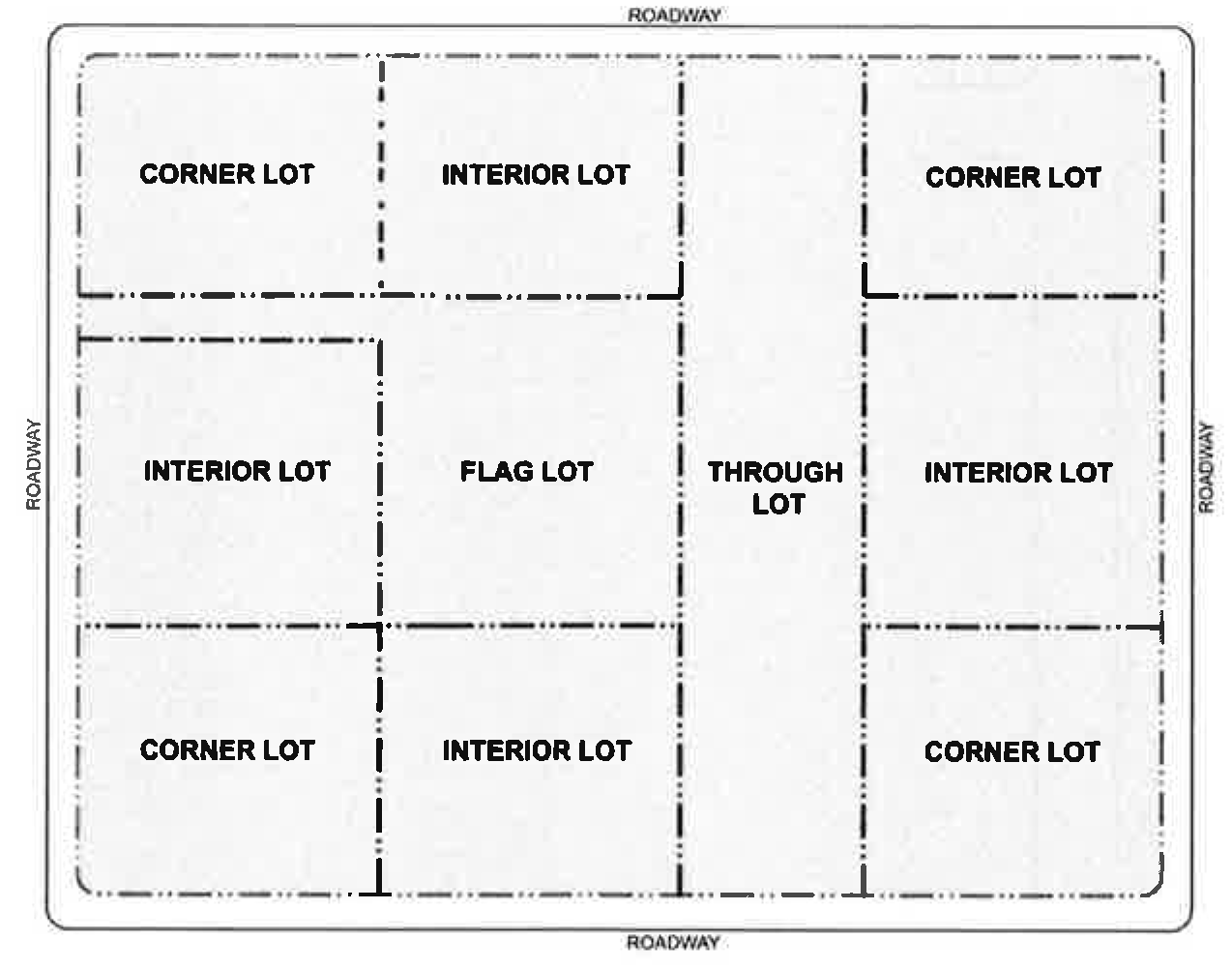 Lot, through: A lot other than a corner lot with frontage on more than one street other than an alley. Through lots with frontage on two streets may be referred to as "double frontage lots".