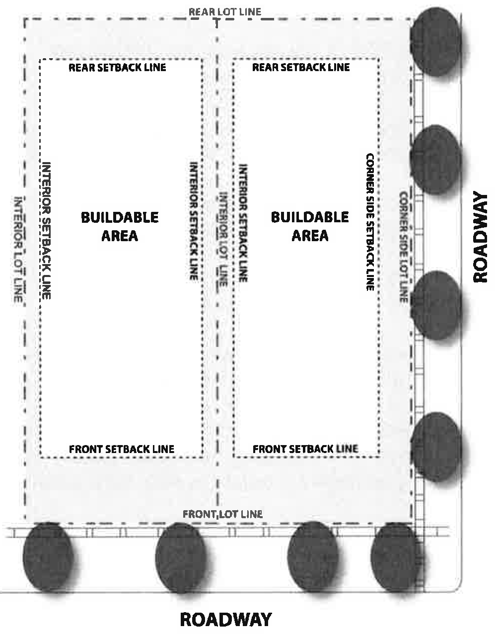 Corner side setback: A line parallel to and at a distance from the corner side lot line that establishes the minimum distance between the corner side lot line and a structure on a lot.