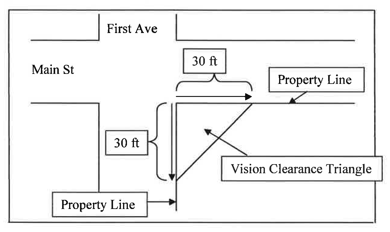Vision clearance triangle: An area located at the intersection of two streets delineated by measuring 30 feet from the intersection of the two right-of-way lines as depicted in figure 7 below.
