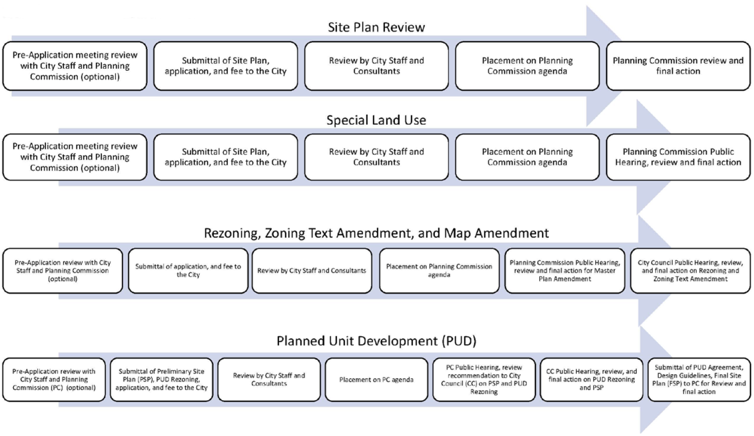 The process for application and review by the city for site plan review, special land use approvals, planned unit developments (PUDs), condominium developments, text amendments to this chapter, and rezonings of land is shown on figure 2.2 development review process. Submittal dates, application forms, and information on fee requirements are available at the city offices.