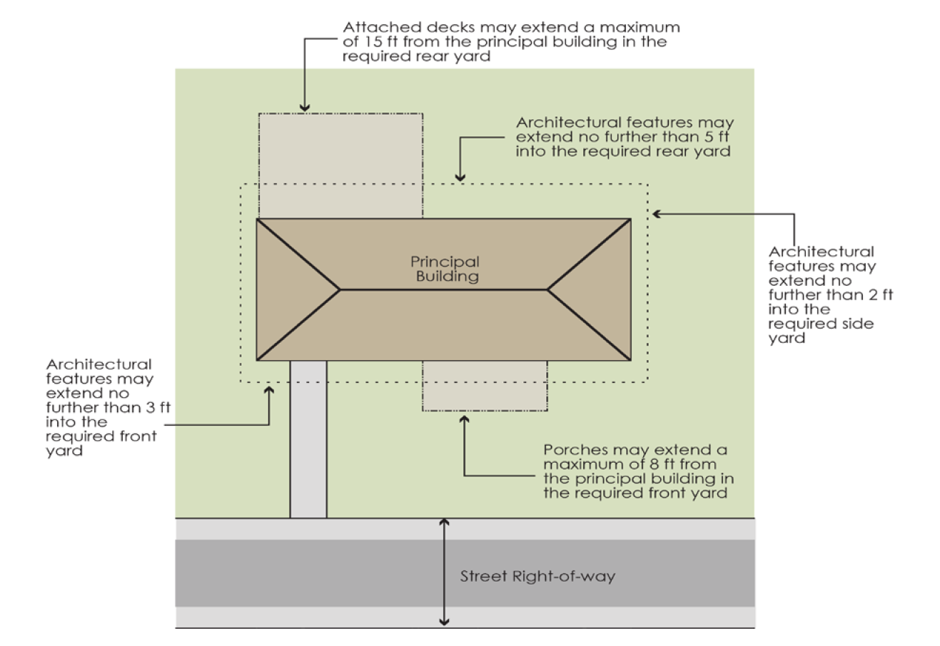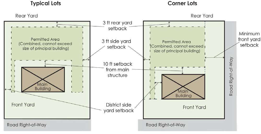 Detached, accessory buildings and structures shall only be located in the yards as shown in table 2.1 and shown in figure 2.1.
