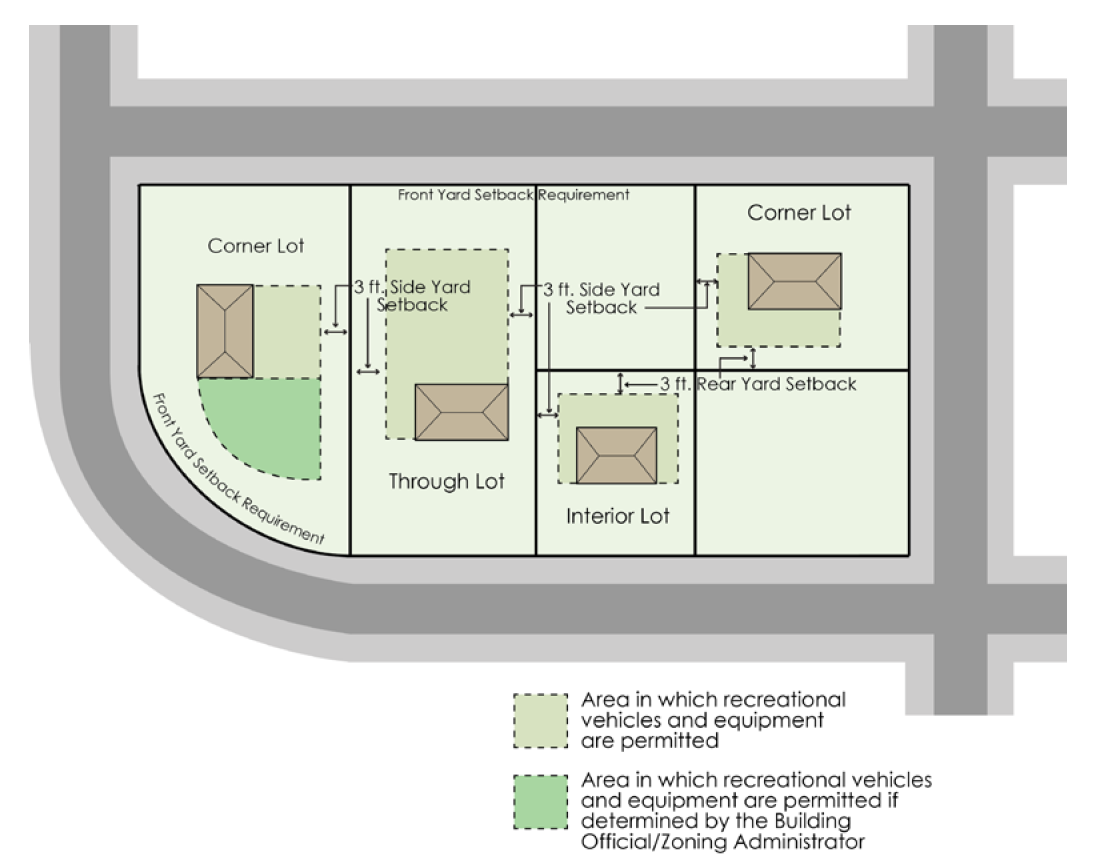 Generally. Registered and operable recreational vehicles and/or recreational equipment shall be prohibited in the front yard unless otherwise permitted in this section. Recreational vehicles or equipment shall be placed or parked in the rear yard or side yard behind the front building line, on a hard paved surface not closer than ten feet from any structure and set back a minimum of three feet from any lot line, except as provided in paragraphs b. through f. below.