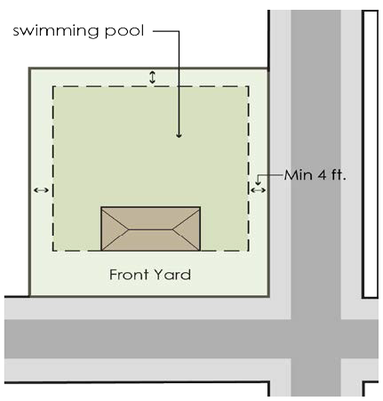 Swimming pools, spas, hot tubs, and similar devices are only permitted in the rear yard and may not be placed in a side or front yard.