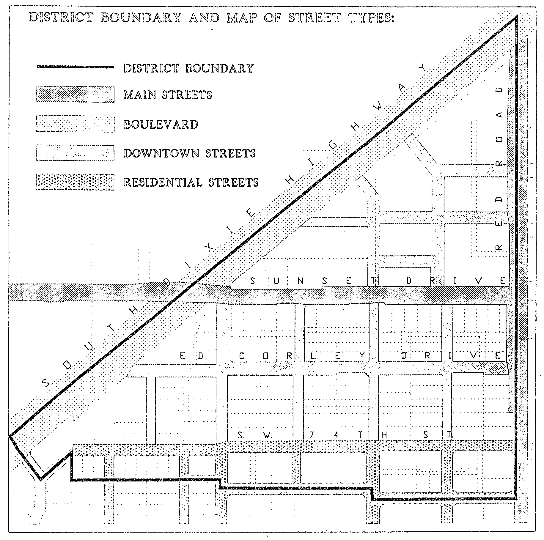 Street Standards Graphic, District Boundary and Map of Street Types.