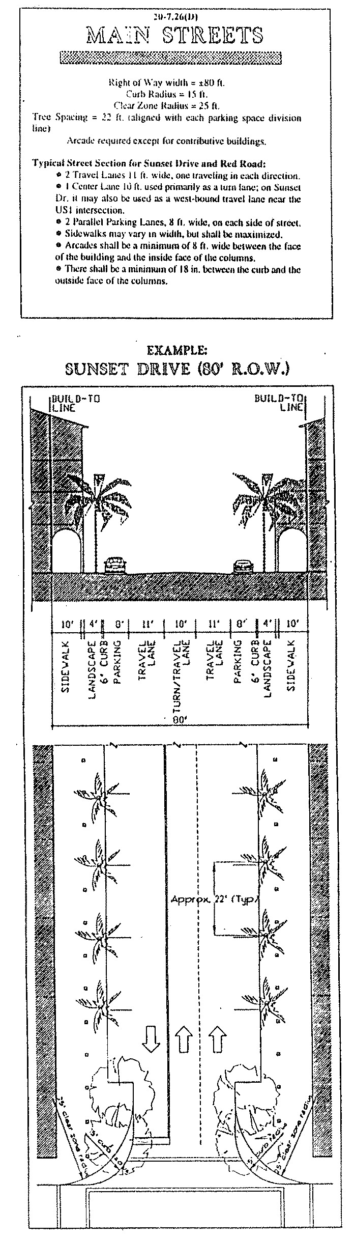 Palms may be used as street trees in front of buildings which have arcades or colonnades. Approved species include: Royal, Washingtonian, and Sable Palmetto. In addition, clusters of Paurotis, Alexander, or Macarthur are permitted for accent at mid-block and street corner locations only.