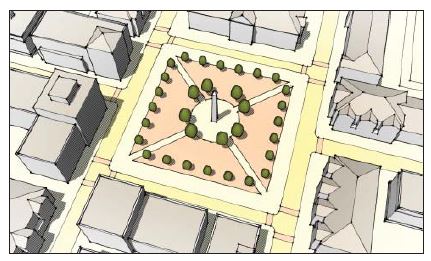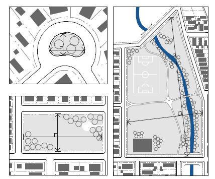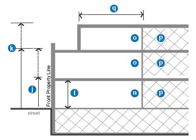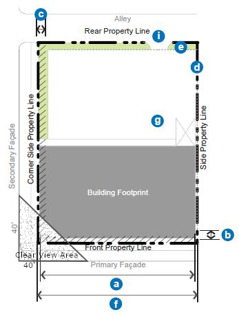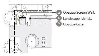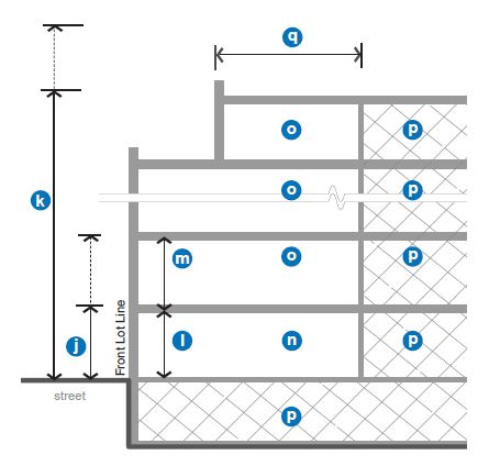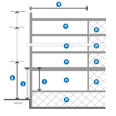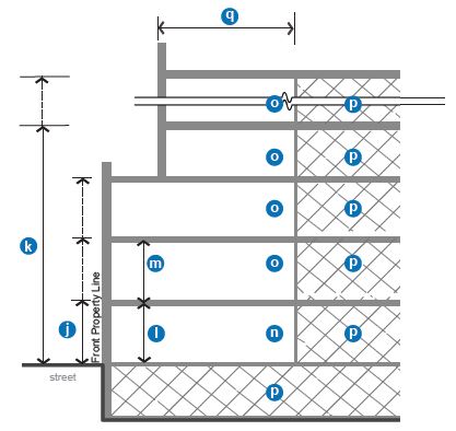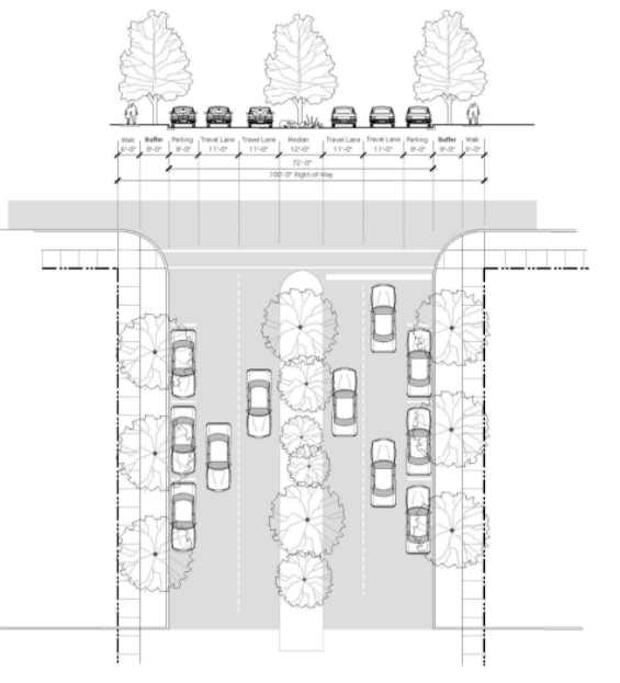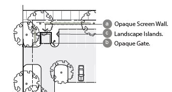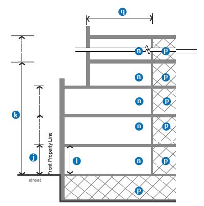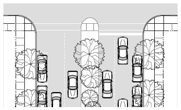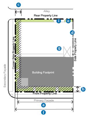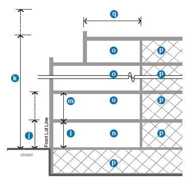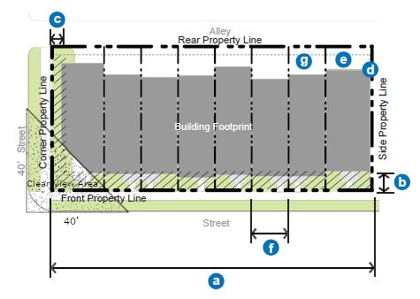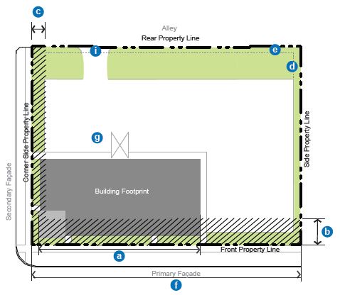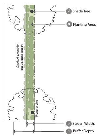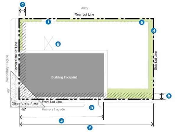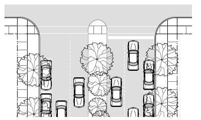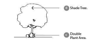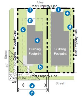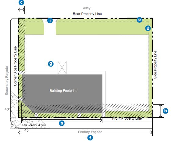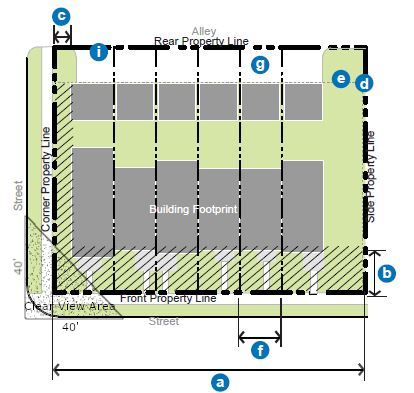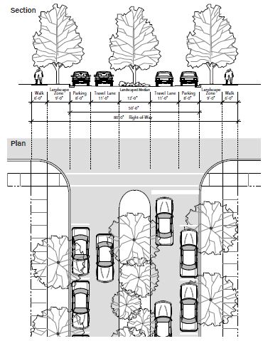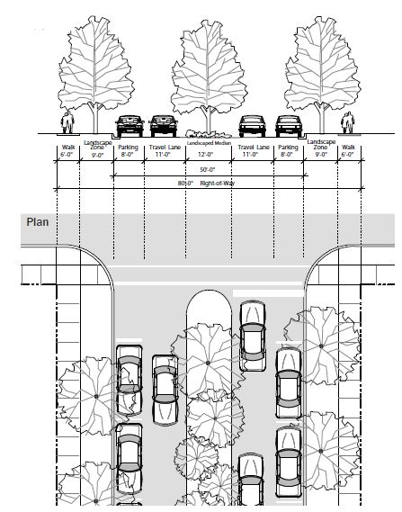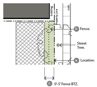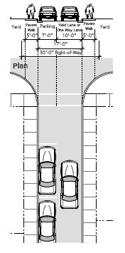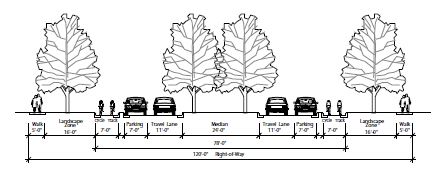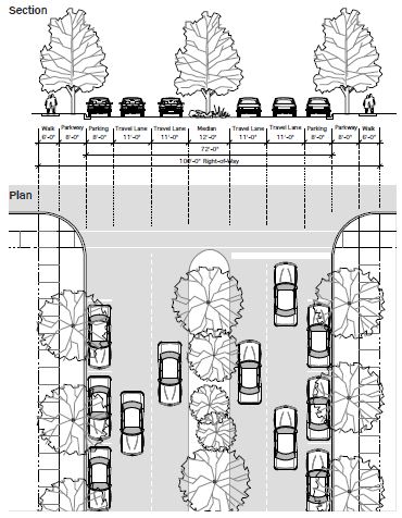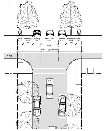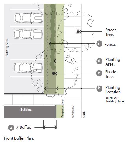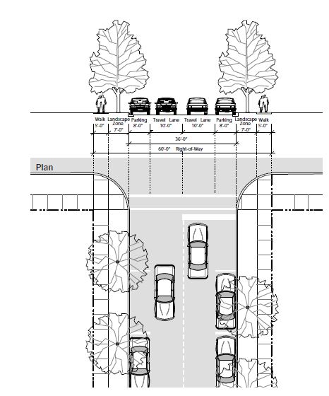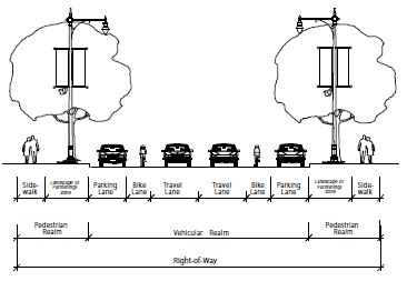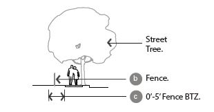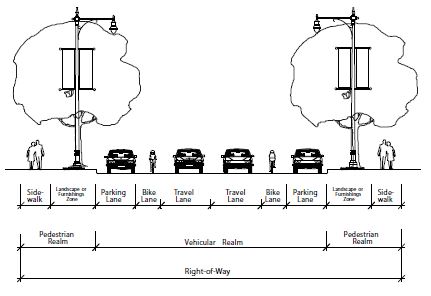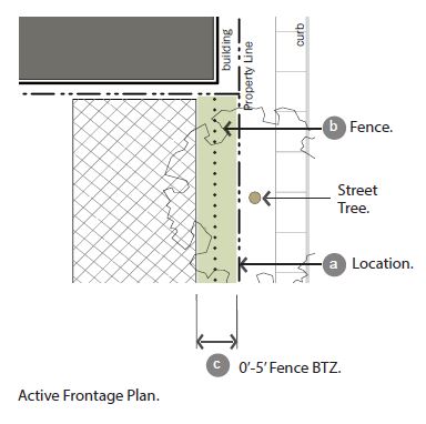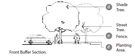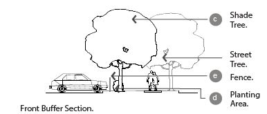 | Buffer | Minimum 5' wide landscape zone or furnishings zone, both sides; adjacent to residential districts, open space districts, the planting zone is required |