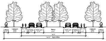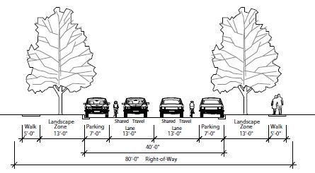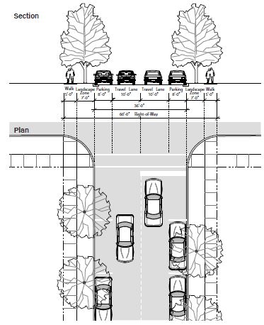 | Parking lanes1 | Parallel required on both sides of street; angled permitted for alternative3 |