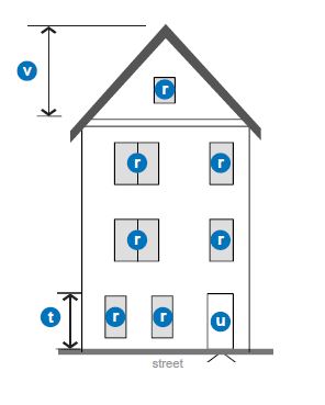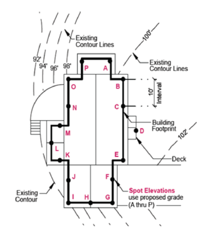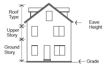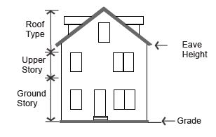 On sloped sites, building height is measured from the average finished grade (grade plane) highest point of the coping of a flat roof, or the deck line of a mansard roof, or to a point midway between the lowest part of the eaves or cornice and ridge of a pitch or hip roof. To calculate the average finished grade (grade plane):