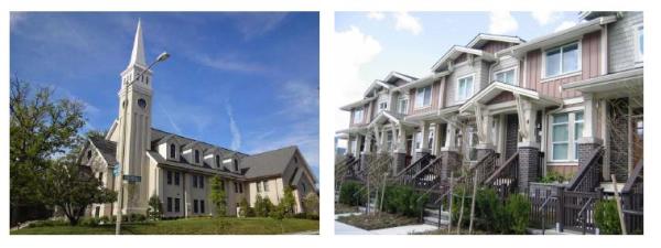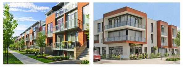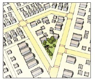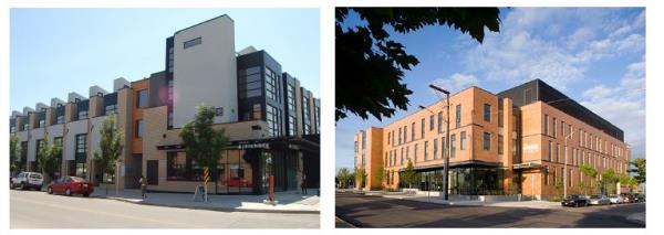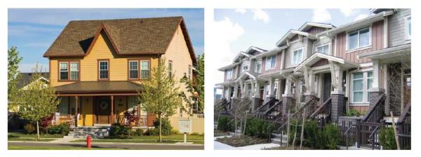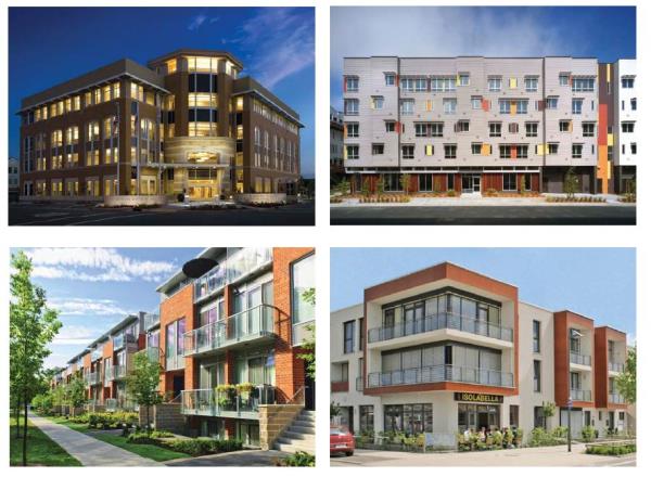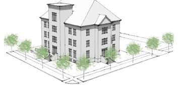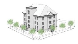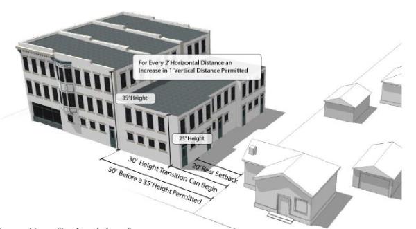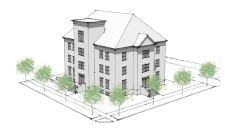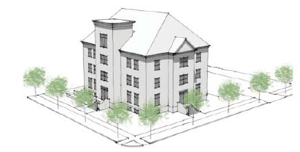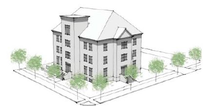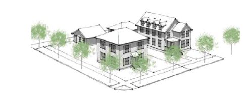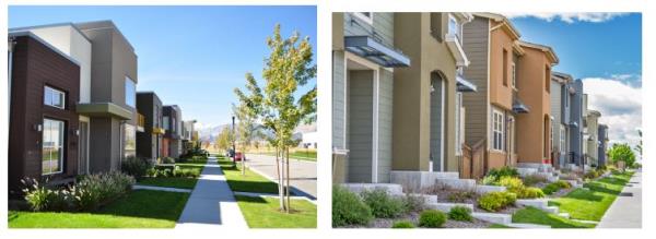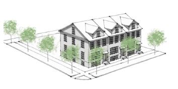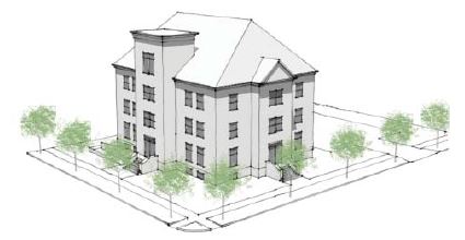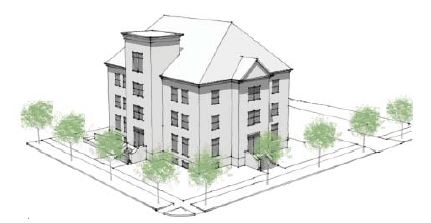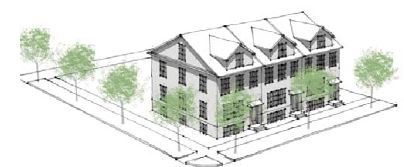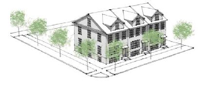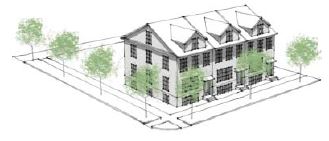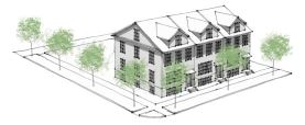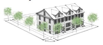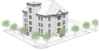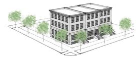 The edge subdistricts are made up of smaller scale residential buildings, which provide a buffer between existing single family residential neighborhoods and the commercial subdistricts. Building heights range from 1 - 3.5 stories.