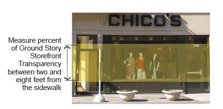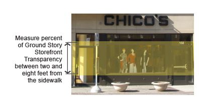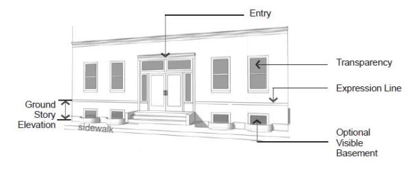 BASEMENT, VISIBLE: A half story partially below grade and partially exposed above with required transparency on the street facade. A visible basement shall count as a half-story, for purposes of height measurement.