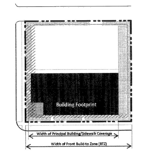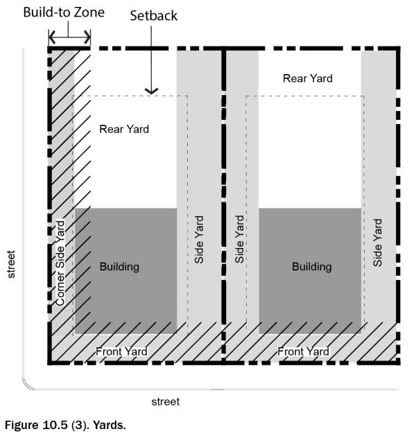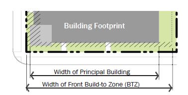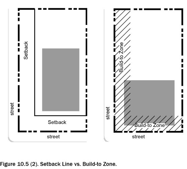 BUILD-TO-ZONE: An area in which the front or corner side facade of a building shall be placed; it may or may not be located directly adjacent to a property line. The zone dictates the minimum and maximum distance a structure may be placed from a property line. Refer to figure 10.5(2), "Setback Line Vs. Build-To Zone," of this section.