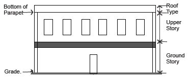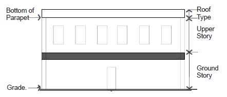 ROOF TYPE: The detail at the top of a building that finishes a facade, including a pitch roof with various permitted slopes and a parapet. Refer to section 10-5.1B-5-10 of this article for more information and a list of the permitted roof types.