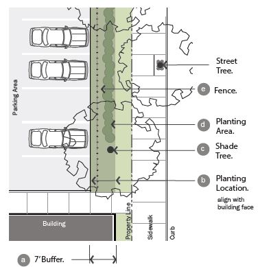 | Street buffer | Minimum 7' wide landscape zone or furnishings zone |
