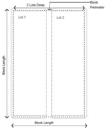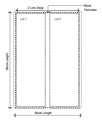 BLOCK LENGTH: A block measurement that is the horizontal distance along the front property lines of the lots comprising the block.