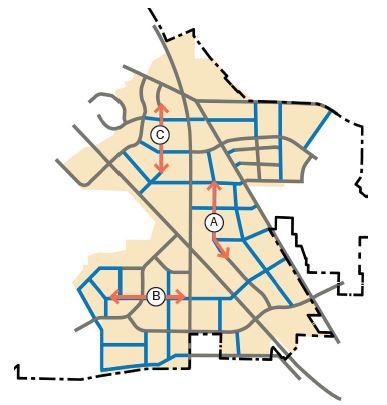 PRIMARY STREET: A major corridor that receives priority over other streets in terms of setting front property lines and locating building entrances.
