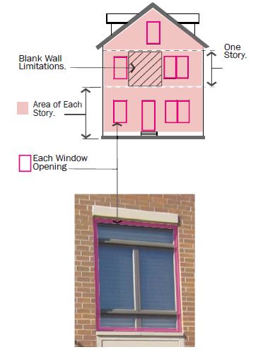 FACADE: The exterior face of a building, including but not limited to the wall, windows, windowsills, doorways, and design elements such as expression lines. The front facade is any building face adjacent to the front property line.
