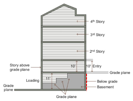 STORY: The portion of a building included between the upper surface of a floor and the upper surface of the floor or roof next above. The story height of a building shall be measured from the average grade plane elevation of the building.