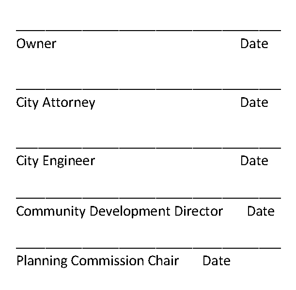 Form for endorsements by the Planning Commission Chair, City Mayor, Community Development Director, City Recorder, City Engineer, City Attorney, culinary water authority, sanitary sewer authority, Salt Lake County Health Department (as applicable), all applicable utilities, and other entities as required by the City Engineer and the City Attorney.