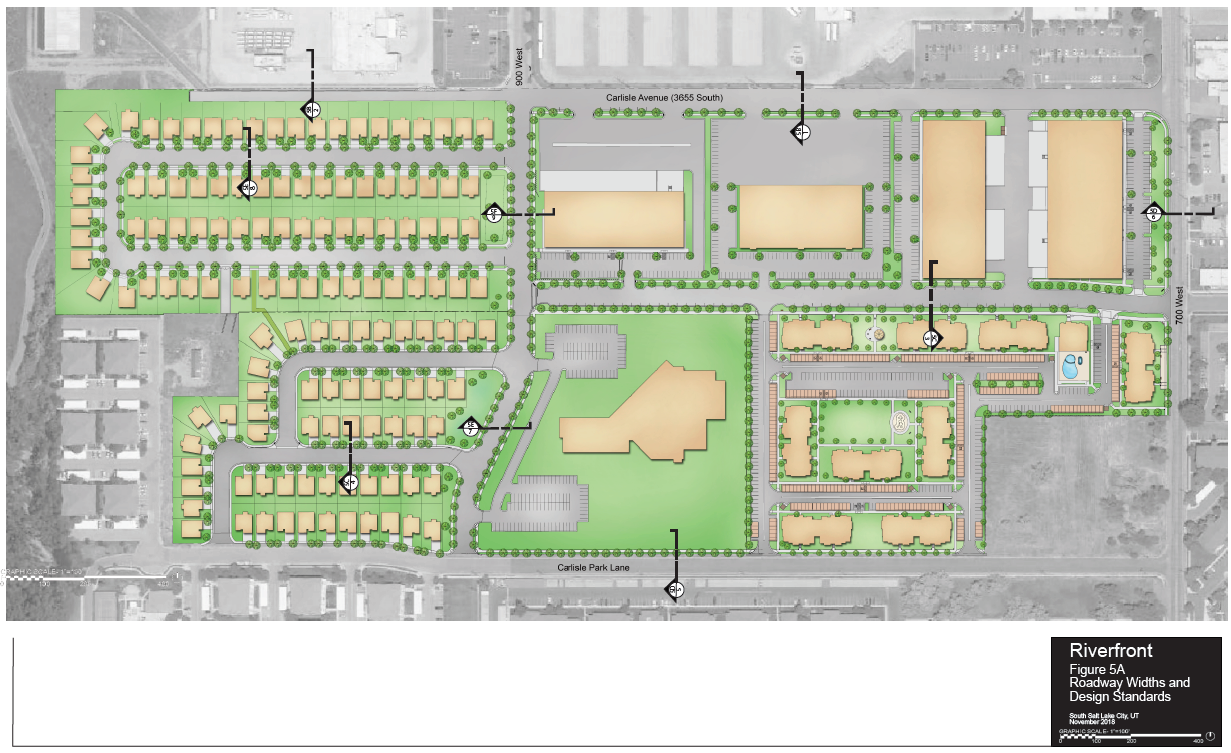 Minimum Width. The minimum width of any Lot or Parcel for a Townhome Project Development is 128 feet along one Public Street. If a Townhome Project Development has access from a second Public Street, the width of the frontage on that Street shall be sufficient to meet all applicable South Salt Lake road profile requirements.