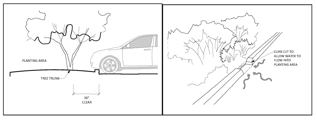 Landscaped Areas shall be protected by concrete vertical curbs. Curbs shall be designed to allow storm water to enter the Landscaped Area. Where such curbs serve as a wheel stop for Parking Stalls, not less than 36 inches shall be provided in the planting area as overhang clearance for tree locations.
