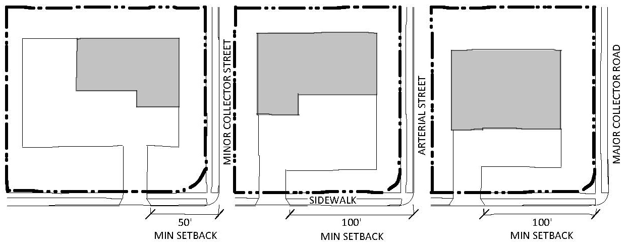 Area. Installation of a minimum of fifteen (15) feet of Landscaping along the entire length of the property between the back of the sidewalk along the urban corridor Street and any fence, Parking Area, or Structure on the Site is required.