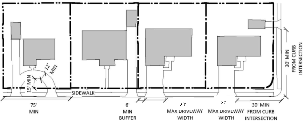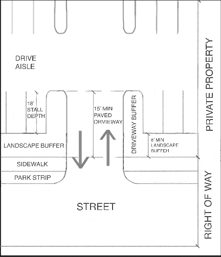 Driveway buffers shall be landscaped. The landscaping shall be a minimum of eight (8) feet in width, as measured from back of curb to back of curb and shall run the length of the driveway.