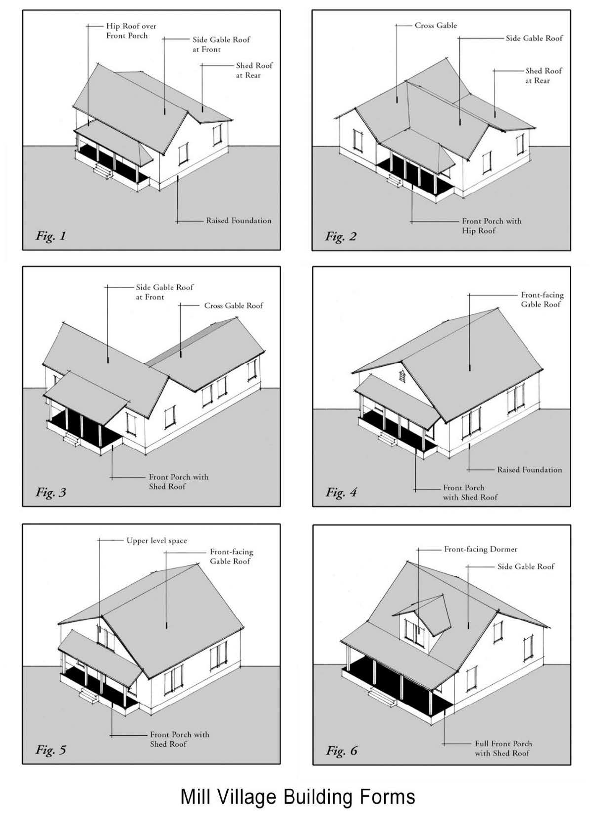 The architectural design of any new dwelling constructed in the Mill Village District Overlay shall substantially comply with the housing depicted in Table MV-1, Mill Village Building Forms.