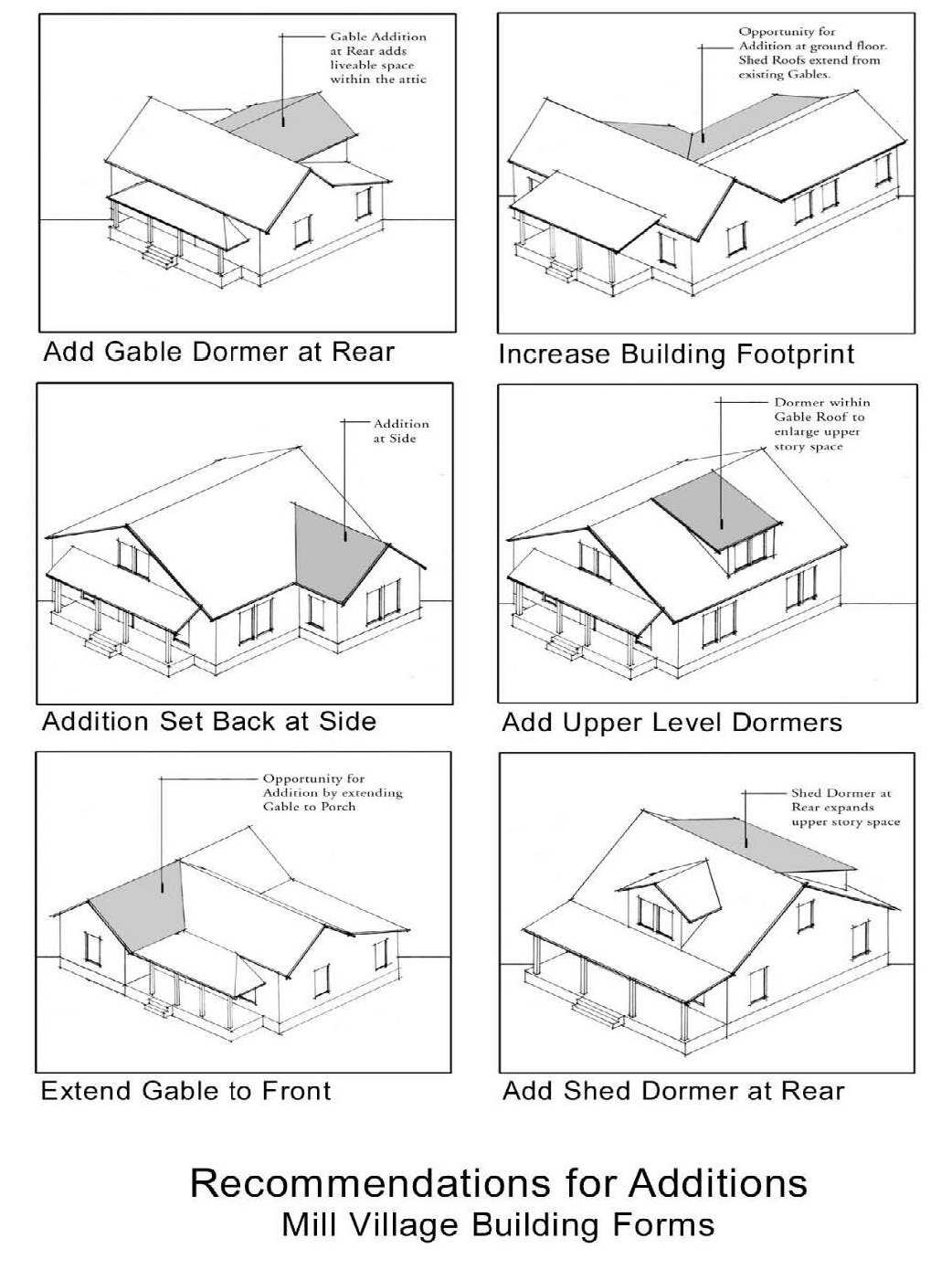 The architectural design of any addition or alteration of any existing structure in the MV District overlay shall substantially comply with the additions or alterations depicted in Table MV-2, Recommendations for Additions, Mill Village Building Forms.