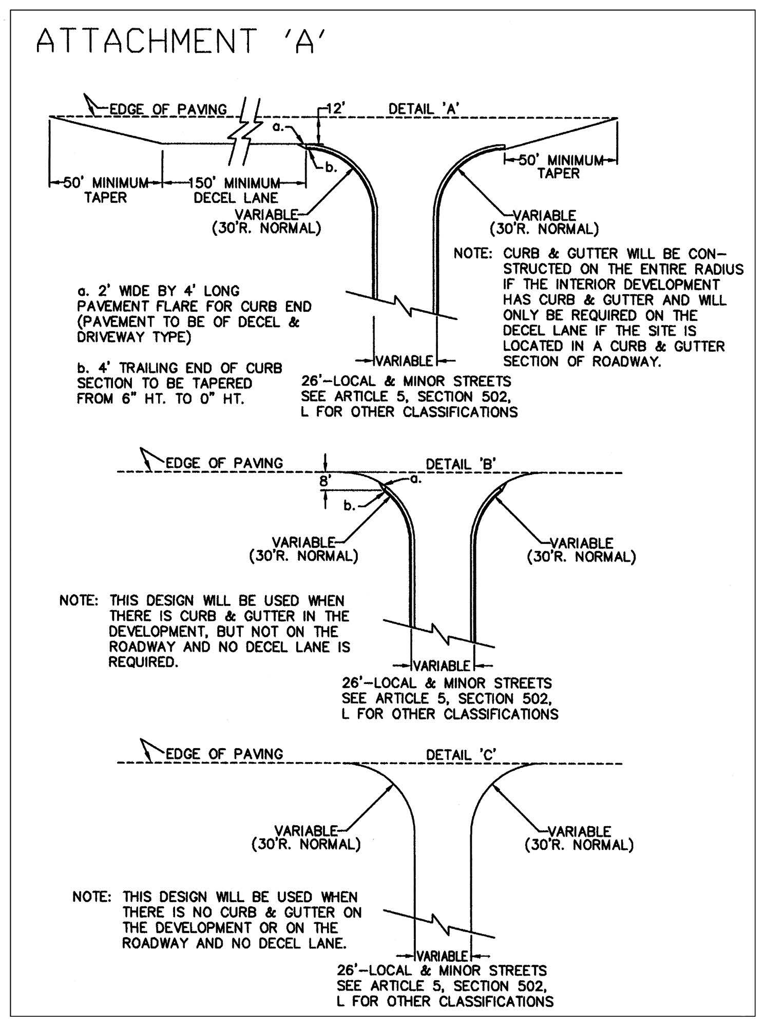 Separate travel lanes: Where necessary, the directional travel lanes should split or curve apart to protect natural features. In cases where travel lanes are split or curve apart, the minimum width of each travel lane shall be fourteen (14) feet in paved width and shall require roll-type curbing.