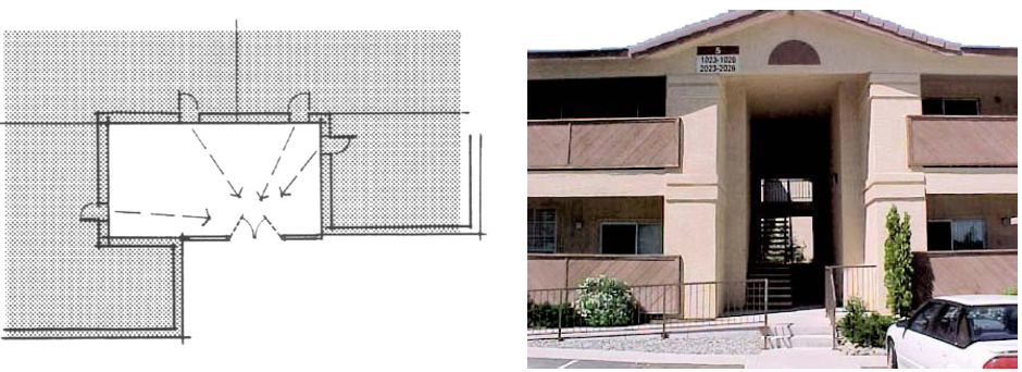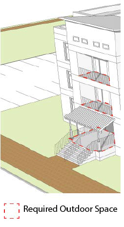 To provide indoor privacy between living spaces, there should be distance separations, buffering or changes in the angle of units. Private outdoor space shall be designed with maximum consideration for privacy, such as separations and orientation of the outdoor space. Building orientation shall provide opportunities for public spaces, for recreation and general open space. Public spaces shall be accessible to the majority of the surrounding units. The common area shall be useable areas and not steep slopes or riparian areas.