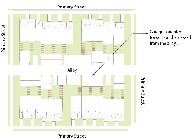 Alley Loading Garages. To ensure compatibility, the garage off the alley shall have architectural features that complement the main structure and shall be oriented so as to not block they alley.