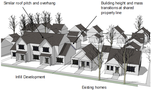 Special design considerations such as height controls, density controls, architectural modifications, and landscaping buffers shall be incorporated in any portion of the development which adjoins a previously approved entitlement.