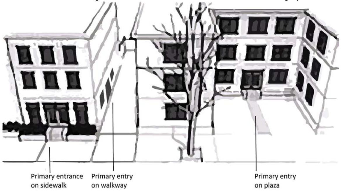 Buildings shall be generally oriented with varying setbacks to provide visual interest and varying shadow patterns.