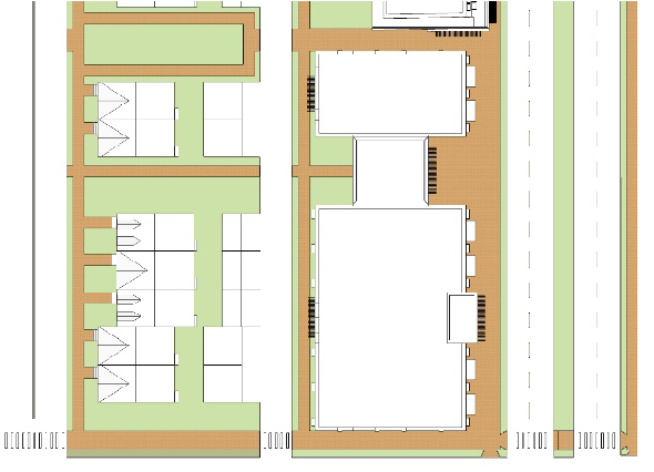 Example of alley loaded garages that are architecturally compatible with the main structure.