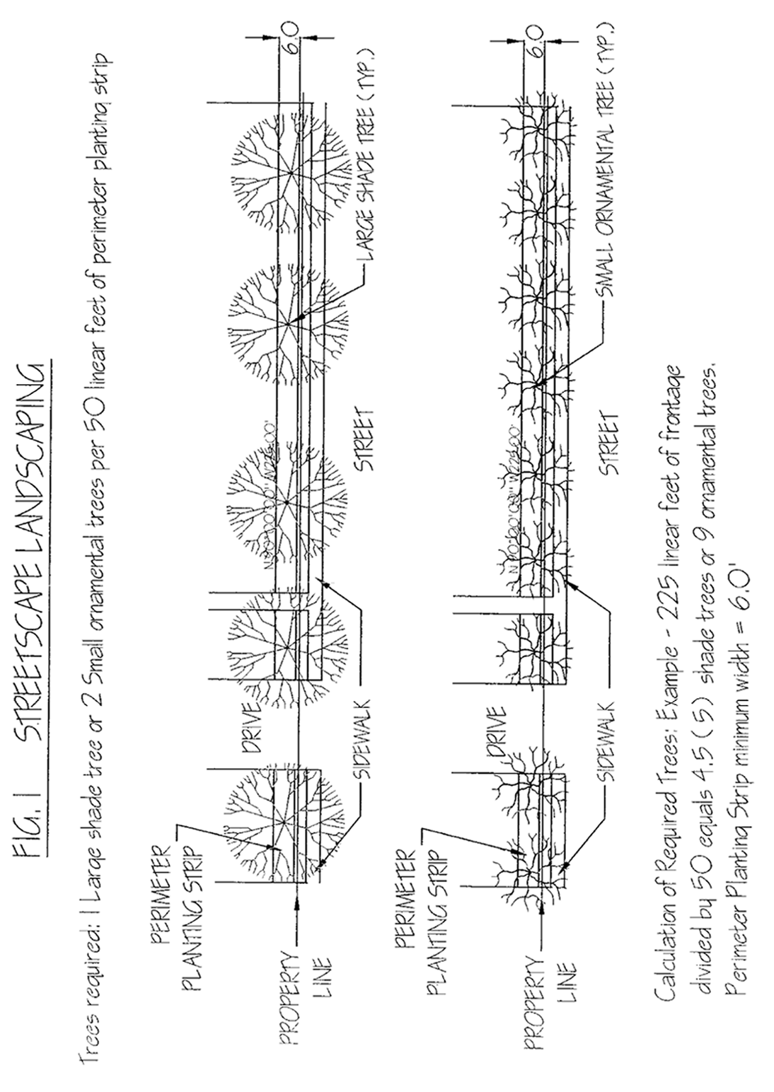 A perimeter planting strip adjacent to the right-of-way (planting area not to be located in the right-of-way) with a minimum width of six feet, provided each streetscape tree shall have a minimum planting area of a three-foot radius, measured from the trunk of the tree. The strip's total length shall be equal to the total length of the property line adjacent to an existing or proposed right-of-way as determined by the adopted thoroughfare plan, exclusive of access drives.