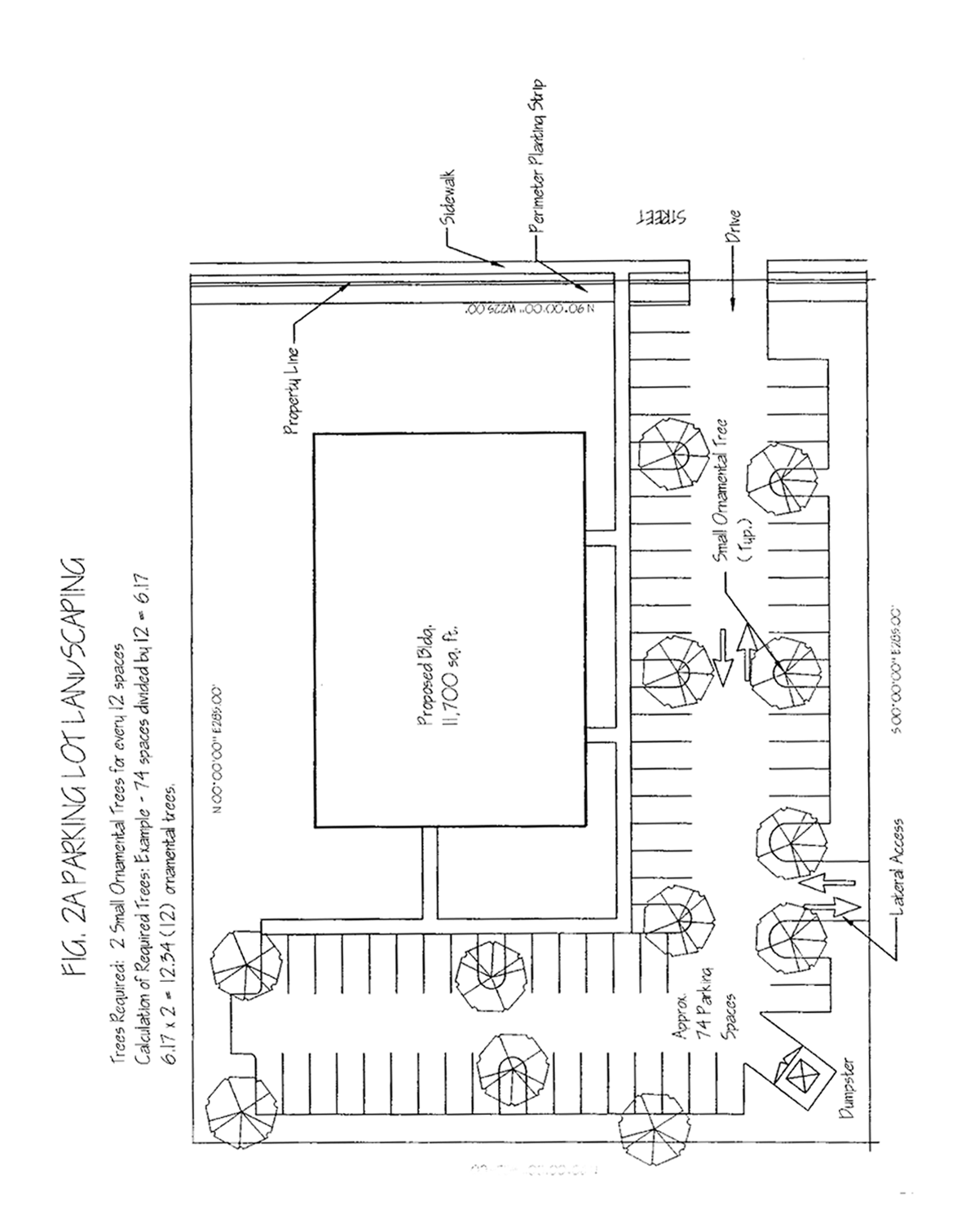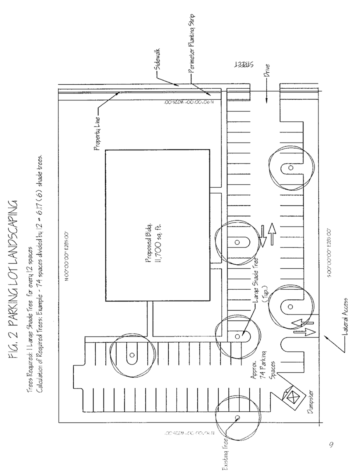 One large shade tree or two small ornamental trees for every 12 parking spaces.
