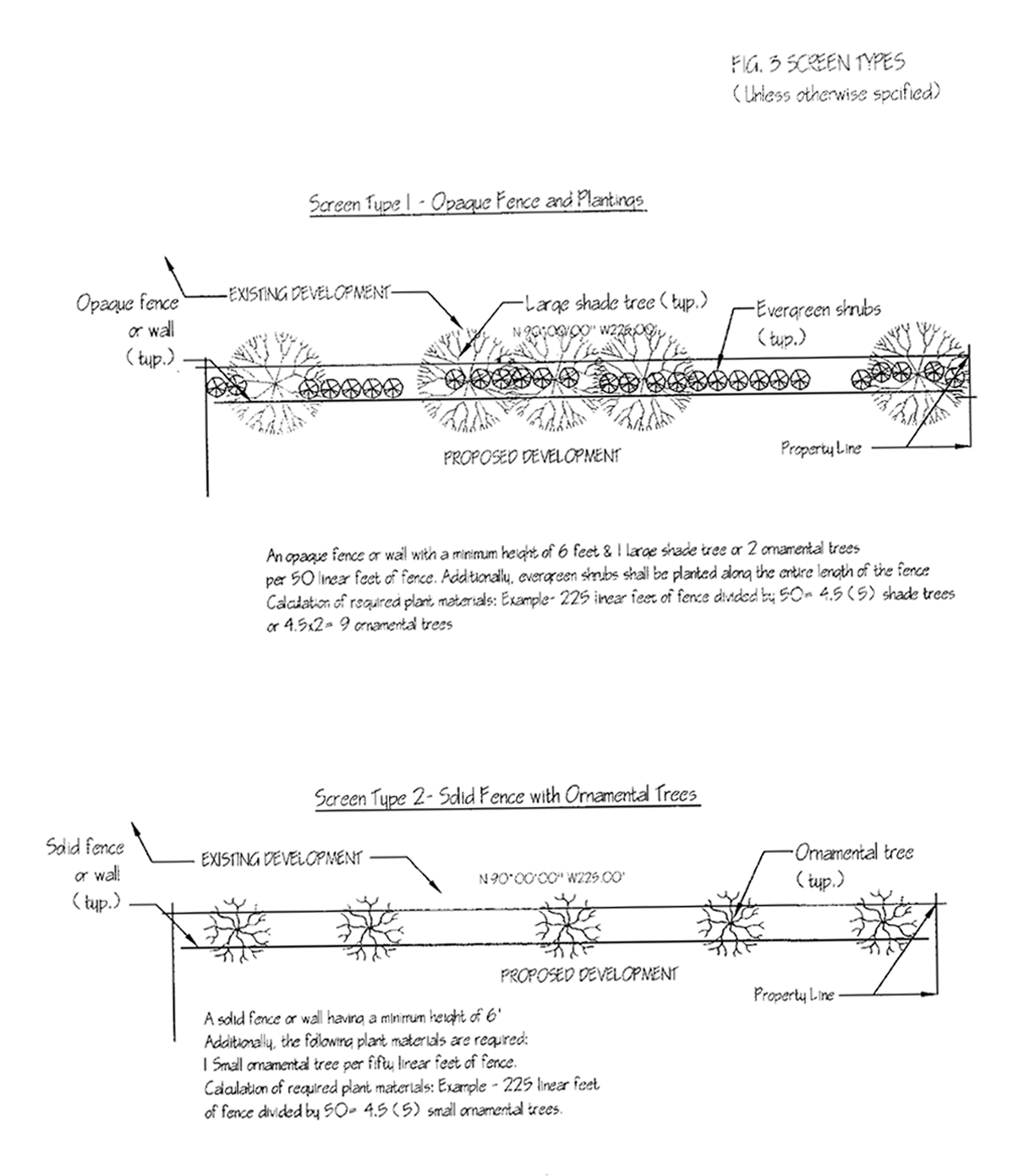 An opaque fence or wall with a minimum height of six feet. Additionally, the following plant materials shall be used in conjunction with an opaque fence or wall: one large shade tree or two small ornamental trees per 50 linear feet. Additionally medium or large evergreen shrubs shall be planted along the entire length of the fence.
