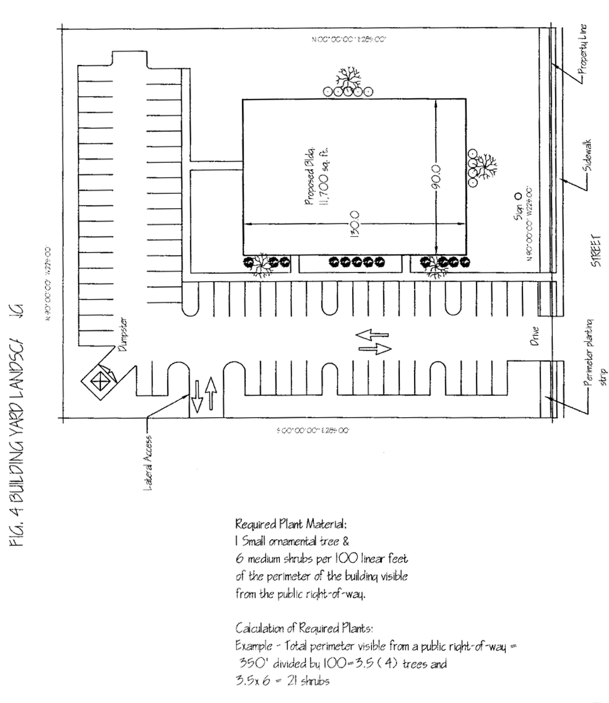 The purpose of this section is to visually and aesthetically enhance the appearance of buildings. Building yards shall be provided along the perimeter of the building visible from a public right-of-way. The required landscaping shall be accomplished by the following: