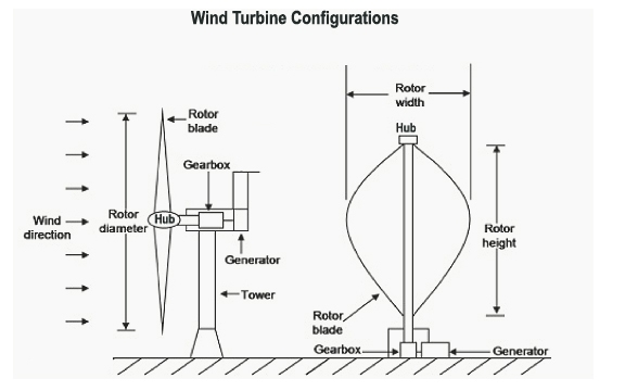 Horizontal axis wind turbine. A wind turbine design in which the rotor shaft is parallel to the ground and the blades are perpendicular to the ground.