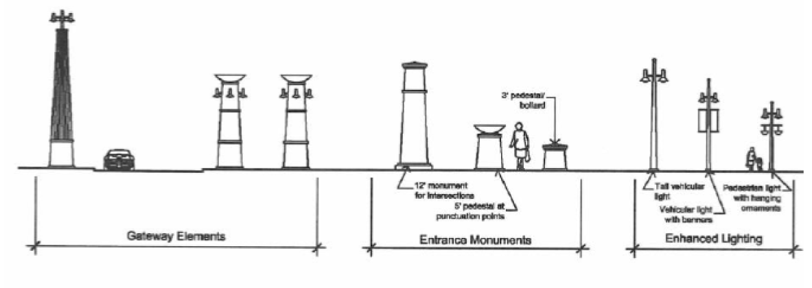 To create an identifiable focal point within the many potential uses as well as creating a unique "brand" for the area.
