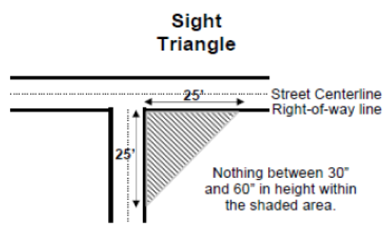 Sight triangle. Installation of a sign shall not constitute a hazard to traffic including but not limited to signs located within the site triangle of an intersection. The sight triangle is defined by a triangular area formed by a diagonal line connecting two (2) points on intersecting street rights-of-way, measured twenty-five (25) feet along each right-of-way starting at the intersection point.
