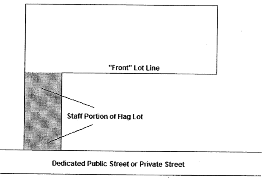 The front side of the flag lot shall be deemed to be the side nearest the street upon which the staff portion fronts. The front setback shall be measured from the lot line nearest the street on which the staff portion of the lot fronts as shown in the figure below. No part of the staff portion of the lot shall be used to meet any setback requirement.