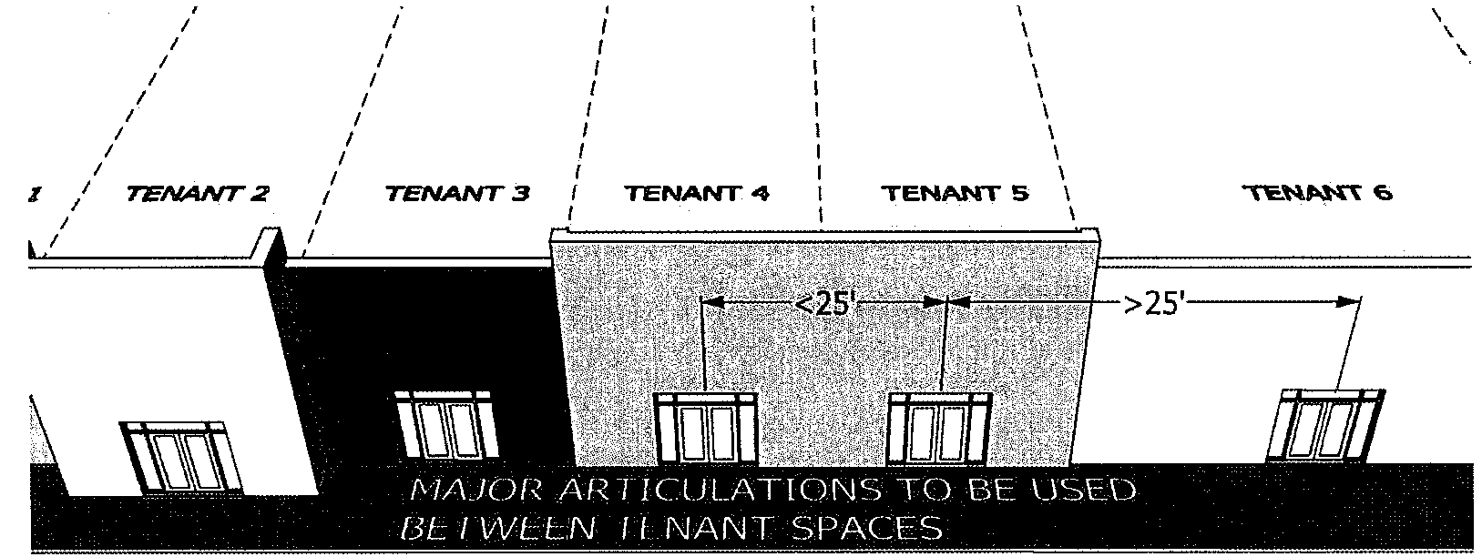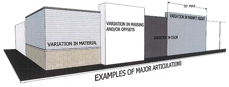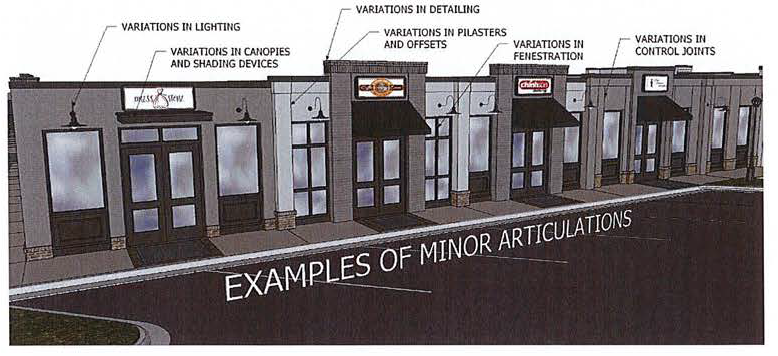 Major Articulations shall occur at least every 50 feet of horizontal facade length or at changes between tenants, whichever is less as stated above. Minor articulations shall occur approximately every 30 feet of horizontal facade length and may be accomplished through the use of pilasters; the use of smaller offsets; or similar means intended to create the appearance of structural bays. Minor Articulations may include variation in shading devices, fenestration, canopies, control joints and/or material trim used to deconstruct the geometry and add variety to a design (diagram D).