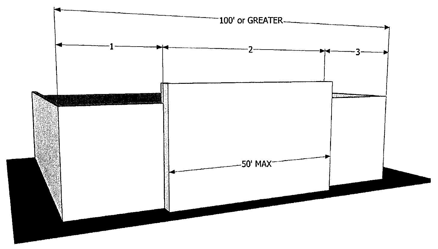 Each new building with elevations over 50 lineal feet corner to corner shall be broken into smaller Major Articulations intended to convey the impression of separate buildings. Facades (over 100 feet) should be broken into at least thirds vertically with a maximum spacing between breaks in materials or massing occurring no less than every 50 feet horizontally or at each change in occupant (diagram A). Each unit within a single building containing multiple units (strip malls) should treat every business' facade (more than 50 feet from the adjacent business measured entry to entry) with a change in material, color and/or massing (diagram B). This variation can be achieved using color changes, material changes, slight projections in material, offsetting of the building envelope or changes in parapet height (diagram C). In general, any change in material or color should also include a change in the profile of the material or outlined with trim. Changes in material and color should not butt one another within the same vertical plane. Changes in perceived massing can be achieved through slight projections of veneers (three to four inches) or changes in parapet heights and are not required to include actual offsets in the footprint.