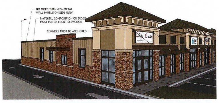 Building exteriors shall all have consistent architectural features, building materials, and rooflines. Elevations of all four sides of the building shall be part of the building permit application. Metal wall panels used as veneer on pre-engineered metal buildings should be limited to no more than 40 percent of any given facade on the front and both side elevations. The same material and color mix approved for the front elevation should be carried around both sides (diagram E). Requirements for both Major and Minor Articulations above will apply to the front elevation as well as to both side elevations.